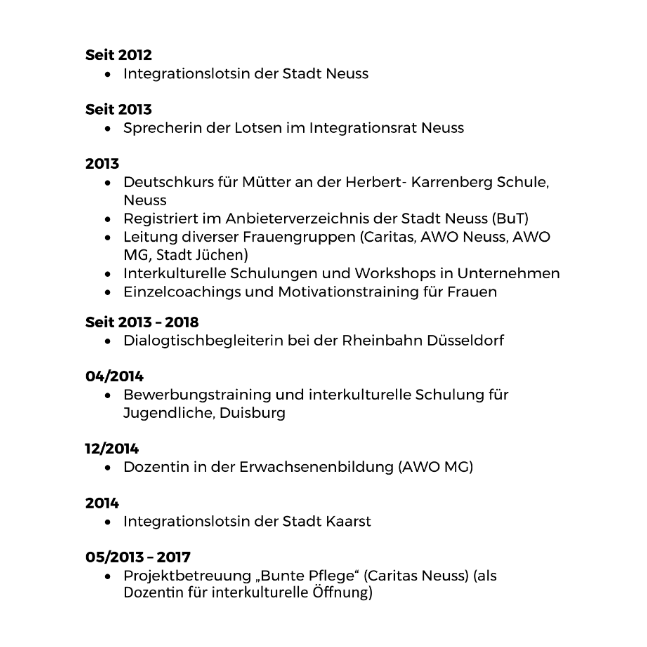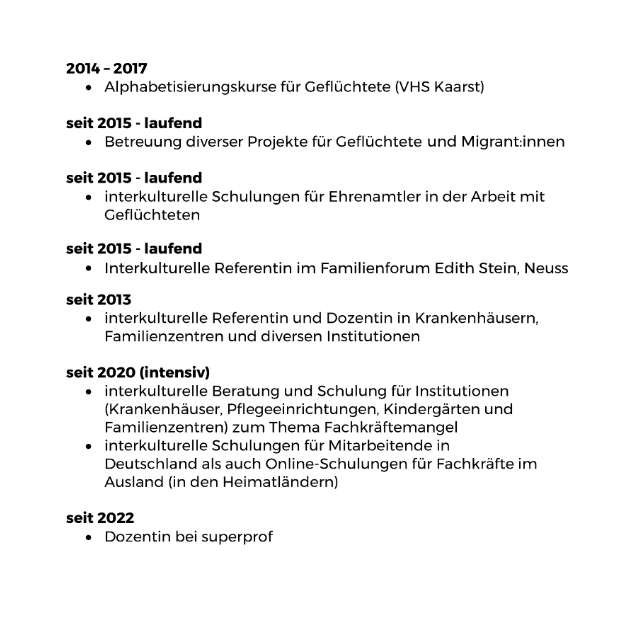 Was mich besonders auszeichnet, ist meine Fähigkeit, zwei Perspektiven zu vereinen. Ich begleite nicht nur Menschen, die neu in Deutschland ankommen, sondern auch diejenigen, die hier leben und im beruflichen oder sozialen Kontext mit Vielfalt in Berührung kommen. Das kann in Institutionen, Schulen, Verwaltungen oder sozialen Einrichtungen sein.